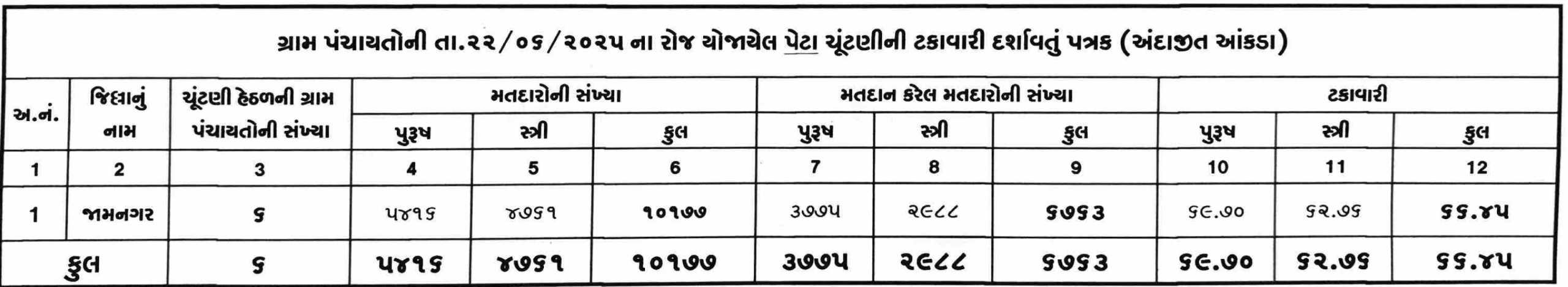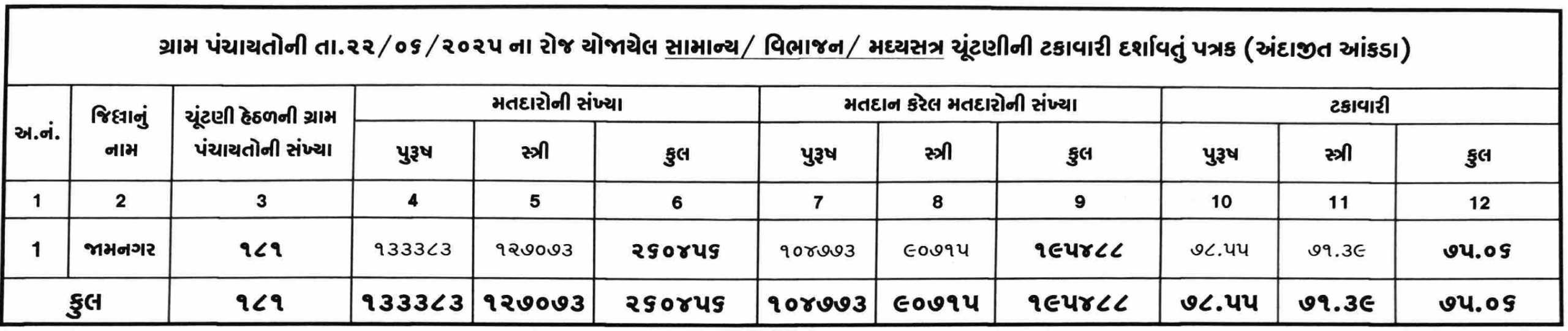 જામનગર જિલ્લાના મુખ્ય ચૂંટણી અધિકારી કલેકટર કેતન ઠક્કરની દેખરેખ હેઠળ ગઇકાલે 174 ગ્રામ પંચાયતમાં સામાન્ય, વિભાજનને કારણે 6, મધ્યસત્રવાળી 1 અને પેટાચુંટણી ધરાવતી 6 મળીને કુલ 187 ગ્રામ પંચાયતોમાં ચૂંટણી યોજાઇ હતી. જેમાં સરપંચો અને સભ્યો મળીને કુલ 407 ઉમેદવારો મેદાનમાં રહ્યા હતાં. આ ચૂંટણીમાં ગઇકાલે સાંજે પાંચ વાગ્યા સુધીમાં 181 ગ્રામ પંચાયતોમાં પુરુષોએ 96,761 અને મહિલાઓએ 84553 મળીને કુલ 1,81,354 મતદારોએ મતદાન કરતાં 69.61 ટકા અને 6 પેટા ચૂંટણીમાં 3496 પુરુષોએ અને 2741 મહિલાઓએ મળીને કુલ 6337 મતદારોએ મતદાન કરતાં 61.29 ટકા મતદાન નોંધાયું હતું.