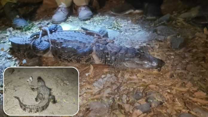 ભાણવડના ત્રિવેણી નદી કાંઠે રાણપરડા પાટિયા નજીક એક વાડીમાં રાત્રીના સમયે એક મગરનું 3 ફૂટ જેટલું નાનું બચ્ચું આવી જતા તે જોઈ વાડી માલિક ખૂબ અચંબિત થઈ ગયા હોય ત્યારે તેઓએ ભાણવડના અશોકભાઈ ભટ્ટને જાણ કરતા તુરંત સ્થળ પર એનિમલ લવર્સના રેસક્યુઅર અને વન વિભાગના કર્મચારીઓ પહોંચી જઈ આ બાળ મગરને રેસક્યુ કરાયું હતું.