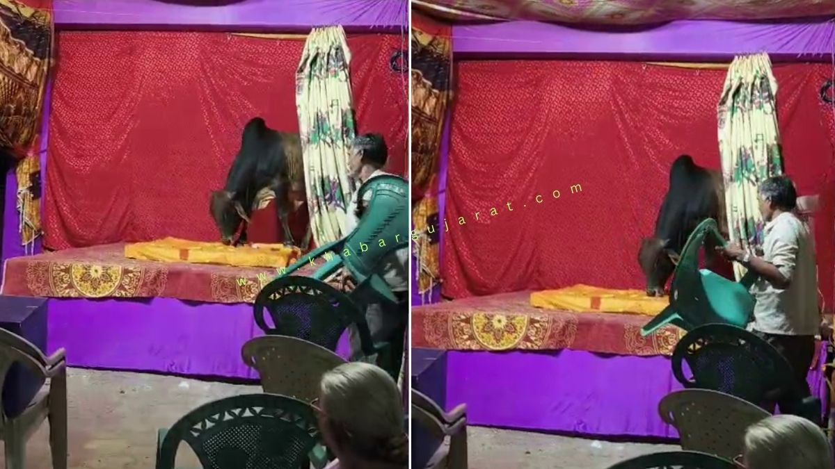 દ્વારકા શહેરના ફુલેકા શેરી વિસ્તારમાં ગણેશ વિસર્જન કાર્યક્રમ દરમિયાન અચાનક એક રખડતો સાંઢ 3 ફૂટ ઊંચા ગણેશ મંડપના સ્ટેજ પર ચઢી જતા ભક્તોમાં નાસભાગ મચી ગઈ હતી. આ અચાનક બનેલી ઘટનામાં મંડળના કાર્યકરોએ જીવના જોખમે આગળ વધી શ્રીગણપતિજીની મૂર્તિને સ્થળ પરથી સલામત રીતે હટાવીને બચાવી હતી.