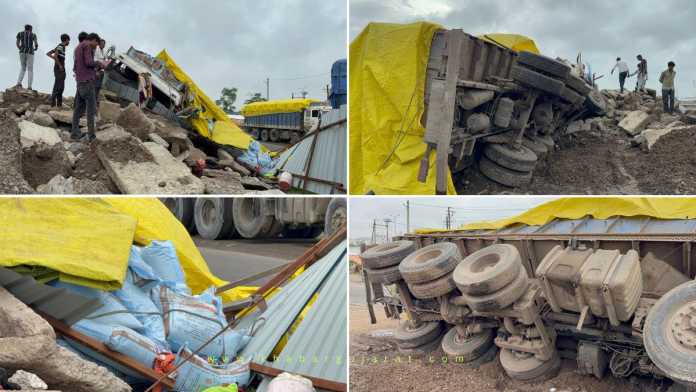 અકસ્માતના બનાવની વિગત મુજબ જામનગર શહેર નજીક લાલપુર બાયપાસ પર પુલનું કામ ચાલી રહ્યું હોય, ડાયવર્ઝન બનાવવામાં આવ્યો છે. આ ડાયવર્ઝન પાસેથી પસાર થતી ખાતર ભરેલી ટ્રક આજે પલ્ટી મારી ગઇ હતી. ડાયવર્ઝનનો માર્ગ સળંગ ન હોવાથી ટ્રકનું બેલેન્સ ગૂમાવતા પલ્ટી મારી ગઇ હતી. ટ્રકમાં ખાતર ભરેલ હોય માર્ગ ઉપર ખાતર ઢોળાઇ જતાં ટ્રાફિક અવરોધાયો હતો. આ ઘટનાની જાણ થતાં પોલીસ દોડી ગઇ હતી અને માર્ગને સાફ કરાવી ટ્રાફિકજામ દૂર કરવાની કામગીરી હાથ ધરી હતી.