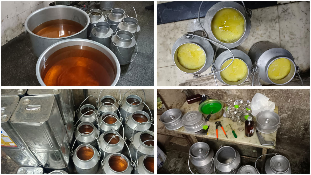 આ અંગેની વિગત મુજબ, જામનગર શહેરમાં કાલાવડ નાકા બહાર ફુલક્રિમ આઈસ્ક્રીમ નામના બોર્ડ મારેલ મકાનમાં હુશેનભાઇ હિંદુસ્તાન ડેરીવાળા ભેળસેળ યુકત ઘી બનાવતા હોવાની એસઓજીના દિનેશભાઈ સાગઠીયા, રમેશભાઈ ચાવડા તથા સોયબભાઈ મકવાને મળેલી બાતમીના આધારે જિલ્લા પોલીસવડા પ્રેમસુખ ડેલુની સૂચના અને એસઓજીના ઈન્ચાર્જ પીઆઈ બી એન ચૌધરી તથા પીએસઆઈ જે.ડી.પરમારના માર્ગદર્શન હેઠળ એસઓજી સ્ટાફ દ્વારા ફૂડ એન્ડ ડ્રગ્સ વિભાગ જામનગરના અધિકારીઓ સાથે જય રેઈડ દરમિયાન અબ્દુલકાદર રજાક કાસ મેમણ તથા હુશેન રજાક કાસ મેમણ નામના શખ્સોને ગેરકાયદેસર રીતે સોયાબીન તેલ તથા વેજીટેબલ ઘી મિકસ કરી અસલ ઘી બનાવતા ઝડપી લીધા હતાં. એસઓજી પોલીસે રૂા.52000 ની કિંમતનું 260 લીટર ભેળસેળ યુકત ઘી, રૂા.41,250 ની કિંમતના 25 નંગ વેજીટેબલ ઘી ના ડબ્બા, રૂા.19560 ની કિંમતના 12 નંગ સોયાબીન તેલના ડબ્બા સહિત રૂા.1,12,810 નો મુદ્દામાલ કબ્જે કર્યો હતો. તેમજ ફુડ એન્ડ ડ્રગ્સ વિભાગ જામનગરના અધિકારીઓ દ્વારા આ શંકાસ્પદ ભેળસેળ યુકત ઘી માંથી સેમ્પલ લઇ આગળની કાર્યવાહી હાથ ધરવામાં આવી હતી.