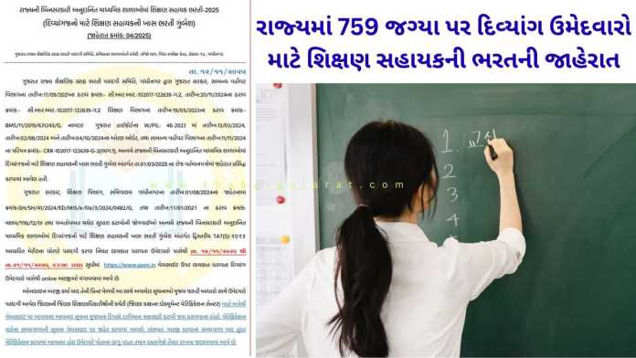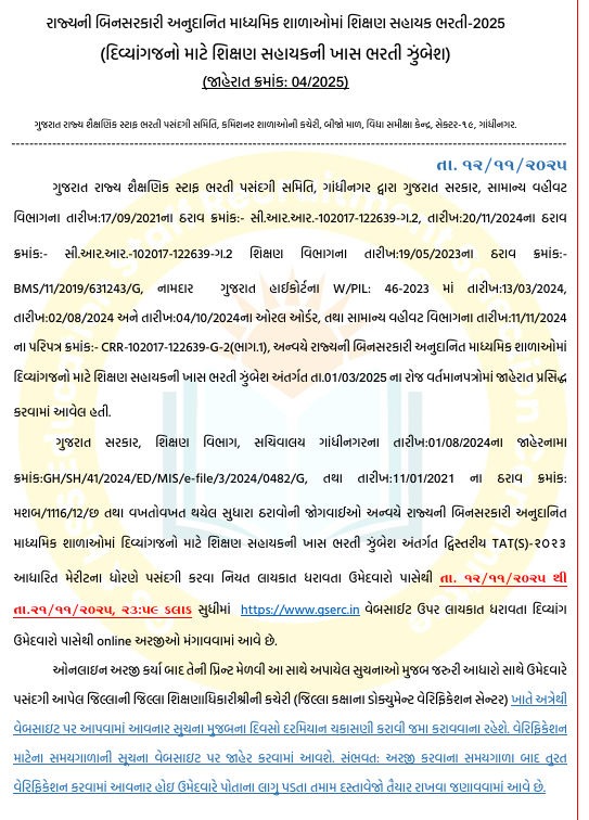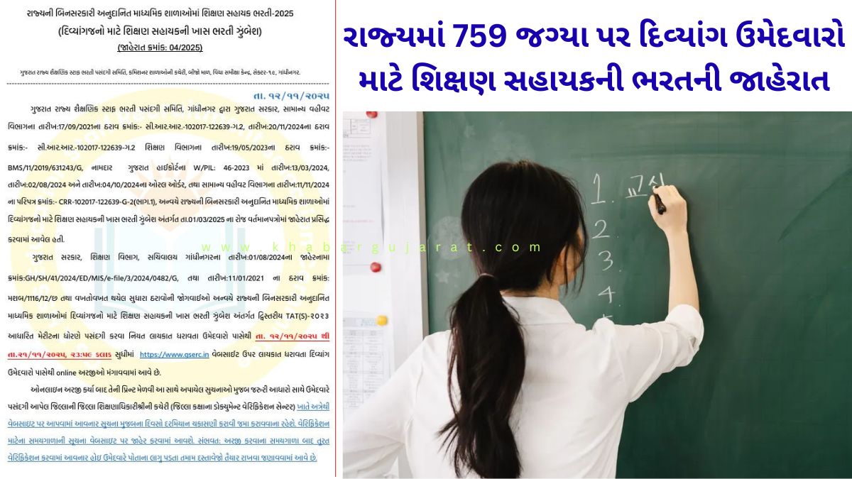 ગુજરાત રાજ્યની ગ્રાન્ટેડ માધ્યમિક શાળાઓમાં શિક્ષણ ક્ષેત્રે કારકિર્દી બનાવવા માંગતા દિવ્યાંગો માટે સોનેરી તક રાજ્યમાં 759 જગ્યા પર ગુજરાત રાજ્ય શૈક્ષણિક સ્ટાફ ભરતી પસંદગી સમિતિ દ્વારા દિવ્યાંગો માટે શિક્ષણ સહાયકની ખાસ ભરતીની જાહેરાત કરવામાં આવી છે અને દ્વિસ્તરીય TAT(S)-2023 આધારિત મેરિટના ધોરણે પસંદગી યાદી તથા પ્રતિક્ષા યાદી 12 નવેમ્બરથી 21 નવેમ્બર 2025 ની રાત્રે 23:59 સુધી સતાવાર વેબસાઈટ gserc.in થી ઓનલાઈન અરજી કરી શકાશે.