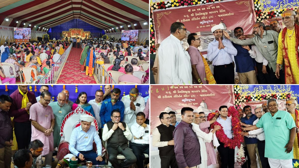 આ અંગેની વિગત મુજબ ખંભાળિયામાં પૂજ્ય પ્રેમભિક્ષુજી મહારાજ પ્રેરિત પ્રેમ પરિવારના સંકીર્તન મંદિરની વિશાળ જગ્યામાં ભગવાન શ્રી રામના ભવ્ય મંદિરના નિર્માણ માટેનો ભૂમિ પૂજન સમારોહ ગુરુવારે યોજવામાં આવ્યો હતો. આ માટે શ્રી હરિનામ સંકીર્તન મંદિર ટ્રસ્ટ દ્વારા ભવ્ય કાર્યક્રમનું આયોજન કરવામાં આવ્યું હતું. જામનગરની જાણીતી ધાર્મિક સંસ્થા અને જેને ગિનીસ બુક ઓફ વર્લ્ડ રેકોર્ડ્સમાં સ્થાન મળ્યું છે તે બાલા હનુમાન મંદિર ટ્રસ્ટના વડપણ હેઠળ ચાલતી આ સંસ્થાના સક્રિય પ્રમુખ જીતુભાઈ લાલની રાહબરી હેઠળ યોજવામાં આવેલા આ નિર્માણ કાર્ય માટે ખંભાળિયાના મૂળ વતની અને રાજ્યસભાના સાંસદ પરિમલભાઈ નથવાણી તેમજ રિલાયન્સના ગ્રુપ પ્રેસિડેન્ટ ધનરાજભાઈ નથવાણી દ્વારા નોંધપાત્ર રકમનું અનુદાન સાંપળ્યું છે. આ ભૂમિ પૂજન