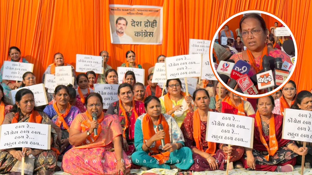જામનગર શહેર ભાજપ પ્રમુખ બીનાબેન કોઠારી, ડે.મેયર ક્રિષ્નાબેન સોઢા, કોર્પોરેટરો ડીમ્પલબેન રાવલ સહિતના મહિલાઓ દ્વારા રાહુલ ગાંધી અને કોંગ્રેસ વિરૂઘ્ધના પોસ્ટરો લઇ સુત્રોચ્ચાર કરી ધરણા કર્યા હતાં. અને વિરોધ પ્રદર્શન કર્યુ હતું.