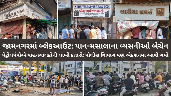 બ્લેકઆઉટ જાહેર કરાયા બાદ જામનગર શહેરમાં આવેલી આશરે 1000 થી વધુ પાનના દુકાનદારોને ત્યાં તથા પાન-મસાલાના હોલસેલ વેપારીને ત્યાં વ્યસનીઓની ભારે ભીડ લાગી પડી છે કેમ કે, યુધ્ધની પરિસ્થિતિ માત્ર આજના દિવસ માટે નથી પરંતુ કલેકટર દ્વારા આજે એક દિવસ માટે બ્લેકઆઉટ જાહેર કરાયો છે ત્યારે પાન-મસાલા માટે તલપાપડ બનેલા વ્યસનીઓ પાનની દુકાનોએ દોડી ગયા છે અને જલ્દીથી પાન-મસાલા લઇ સલામત સ્થળે એટલે કે ઘરે પહોંચી જવા નીકળી પડ્યા છે.