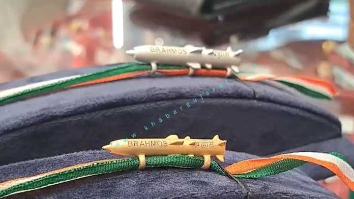 ઓપરેશન સિંદુરથી સમગ્ર દેશમાં દેશભક્તિની ભાવના વધુ પ્રબળ બની છે. ત્યારે સુરતના એક જવેલર્સે આવનારા દિવસોમાં આવતા રક્ષાબંધનના તહેવાર પર બ્રહ્મોસ મિસાઈલની રાખડી બનાવી છે જે લોકોમાં આકર્ષણનું કેન્દ્ર બની છે. આ રાખડી સોનામાં 9 કેરેટ અને 7 ગ્રામ વજનની છે અને ચાંદીમાં 16 ગ્રામ વજનની બનાવી છે. જેના દ્વારા સોનું-ચાંદી ધારણ કરી શકાય અને દેશભક્તિનું સંગમ પણ બની રહે. આમ, જયારે કોઈ બહેન ભીના કાંડા પર બ્રહ્મોસ મિસાઈલની રાખડી બાંધશે ત્યારે તે રક્ષણ અને દેશભક્તિનું પ્રતિક બનશે.