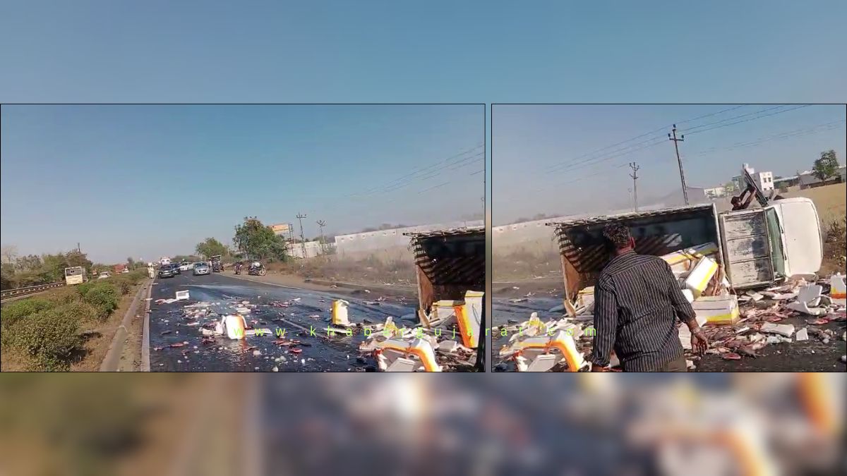 ફલ્લા પાસે ગાડી ડિવાઈડર સાથે અથડાઇ, ત્રણ ગોથા ખાધા બાદ ડ્રાઈવર સુરક્ષિત – VIDEO