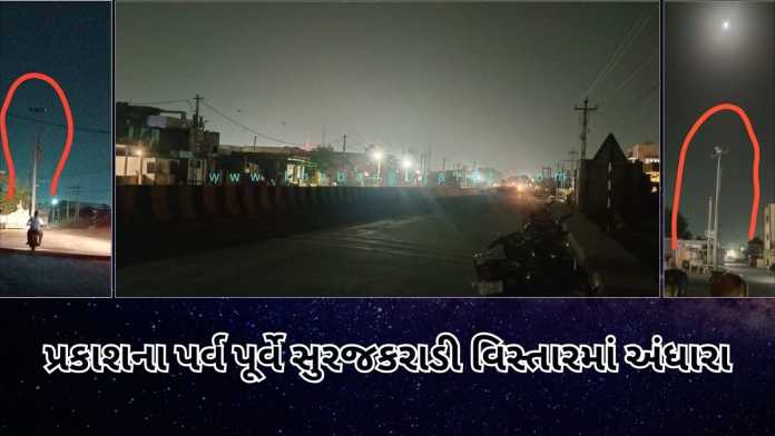 ઓખા નગરપાલિકાના અંધેર વહિવટના પાપે સુરજકરાડી વિસ્તારમાં દિવાળી જેવા ઉજાસ ઉમંગના તહેવારોમાં અંધારા છવાયા છે. સુરજકરાડી હાઇવે રોડ મુખ્ય બજારમાં 30માંથી 20 સ્ટ્રીટ લાઇટ બંધ પડી હોય નગરજનોમાં રોષની લાગણી છવાઇ છે.