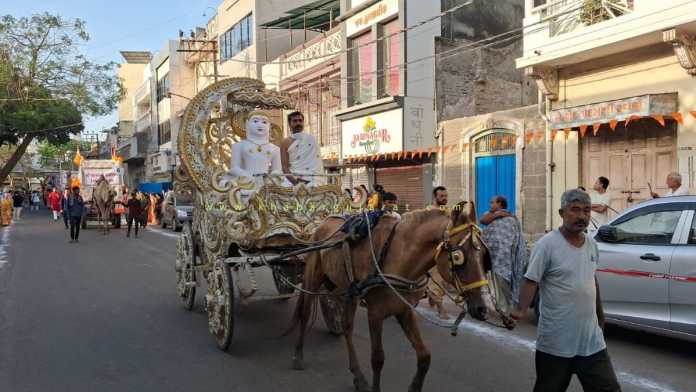 ભગવાન શ્રી મહાવીરસ્વામીની રથયાત્રા પ.પૂ. પન્યાસ વજ્રસેનવિજયજી મ.સા.ના લઘુગુરુ પ.પૂ. મુનિરાજ કમલસેનવિજયજી મ.સા. તથા પ.પૂ. પન્યાસ પ્રવર હેમતિલકવિજયજી મ.સા. તથા પૂ. સાધ્વીજી ભાવવર્ધનાશ્રીજી મ.સા.ના શિષ્યા પૂ. સાધ્વીજી શ્રી ભવ્યવર્ધનાશ્રીજી મ.સા. આદી ઠાણા તથા જામનગરમાં બિરાજમાન તમામ સંઘમાં બિરાજમાન સાધુ-સાધ્વીજીની નિશ્રામાં આજે સવારે શહેરના શ્રી શેઠજી દેરાસર ચાંદીબજારથી નિકળી સજુબા સ્કૂલ, ખાદી ભંડાર, ટાઉનહોલ, લાલબંગલો, પોપટલાલ ધારશી જિનાલયે થઈ જી.જી. હોસ્પિટલ રોડ, ડીકેવી રોડ થઈ પેલેસ મહાવીરસ્વામી જિનાલયે પૂર્ણ થઇ હતી. જ્યાં મહારાજ સાહેબના વ્યાખ્યાન બાદ નવકારશીનું આયોજન કરાયું હતું.