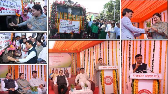 ભારત સરકારના કેન્દ્રીય શ્રમ, રોજગાર, યુવા બાબતો અને રમતગમત મંત્રી ડો. મનસુખ માંડવિયા, ગુજરાત સરકારના વન અને પર્યાવરણ, આબોહવા પરિવર્તન, વિજ્ઞાન અને ટેકનોલોજી મંત્રી અર્જુન મોઢવાડિયા, માનનીય સંસદસભ્ય પૂનમબેન માડમ, માનનીય સંસદસભ્ય રામભાઈ મોકરિયા તથા અન્ય ગણમાન્ય અતિથિઓ દ્વારા 14 નવેમ્બર, 2025ના રોજ રાજકોટ રેલવે સ્ટેશનથી રાજકોટ-પોરબંદર વચ્ચે દોડનારી ઉદ્ઘાટન સ્પેશિયલ ટ્રેનને લીલી ઝંડી બતાવીને શુભારંભ કરવામાં આવ્યો હતો.