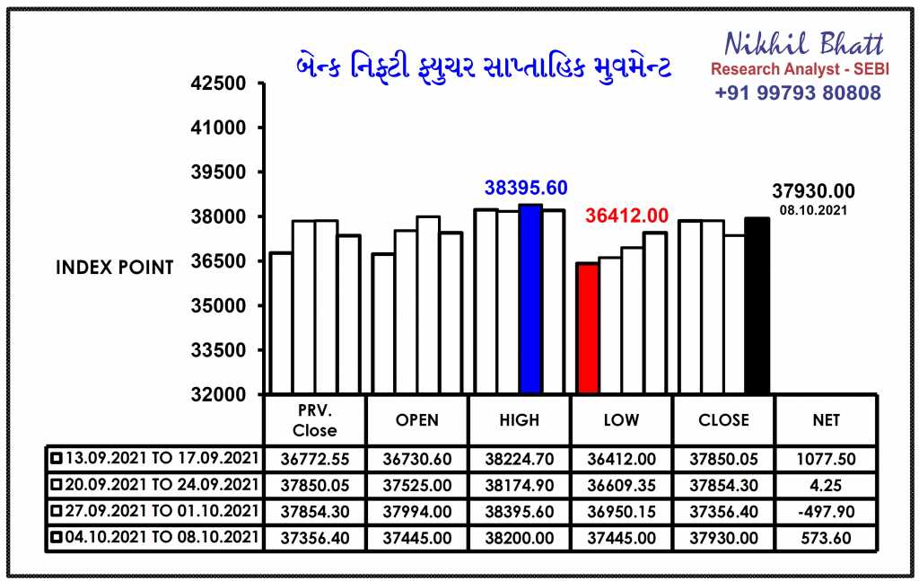 તા.૦૮.૧૦.૨૦૨૧ ના રોજ બેન્ક નિફ્ટી ફ્યુચર બંધ ભાવ @ ૩૭૯૩૦ પોઈન્ટ :- આગામી સંભવિત બેન્ક નિફ્ટી ફ્યુચર ૩૮૬૭૬ પોઈન્ટના પ્રથમ અને ૩૭૦૦૭ પોઈન્ટના અતિ મહત્વના સ્ટ્રોંગ સ્ટોપલોસે ટ્રેડીંગ સંદર્ભે ૩૮૦૦૮ પોઈન્ટ થી ૩૮૧૮૮ પોઈન્ટ, ૩૮૩૦૩ પોઈન્ટ ની અતિ મહત્વની સપાટીને સ્પર્શી શકે તેવી સંભાવના ધરાવે છે. ૩૮૩૦૩ પોઈન્ટ આસપાસ સાવધાનીપૂર્વક પોઝિશન બનાવવી….!!!
