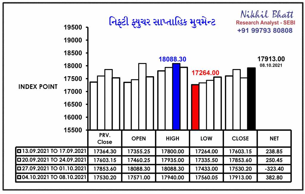 તા.૦૮.૧૦.૨૦૨૧ ના રોજ નિફટી ફ્યુચર બંધ ભાવ @ ૧૭૯૧૩ પોઈન્ટ :- આગામી સંભવિત નિફ્ટી ફ્યુચર ૧૭૮૭૮ પોઈન્ટના પ્રથમ અને ૧૭૮૦૮ પોઈન્ટના અતિ મહત્વના સ્ટ્રોંગ સ્ટોપલોસે ટ્રેડીંગ સંદર્ભે ૧૭૯૭૦ પોઈન્ટ થી ૧૮૦૦૮ પોઈન્ટ ૧૮૦૮૮ પોઈન્ટની અતિ મહત્વની સપાટીને સ્પર્શી શકે તેવી સંભાવના ધરાવે છે. નિફ્ટી ફ્યુચરમાં ૧૮૦૦૮ પોઈન્ટ આસપાસ સાવધાનીપૂર્વક પોઝિશન બનાવવી….!!!