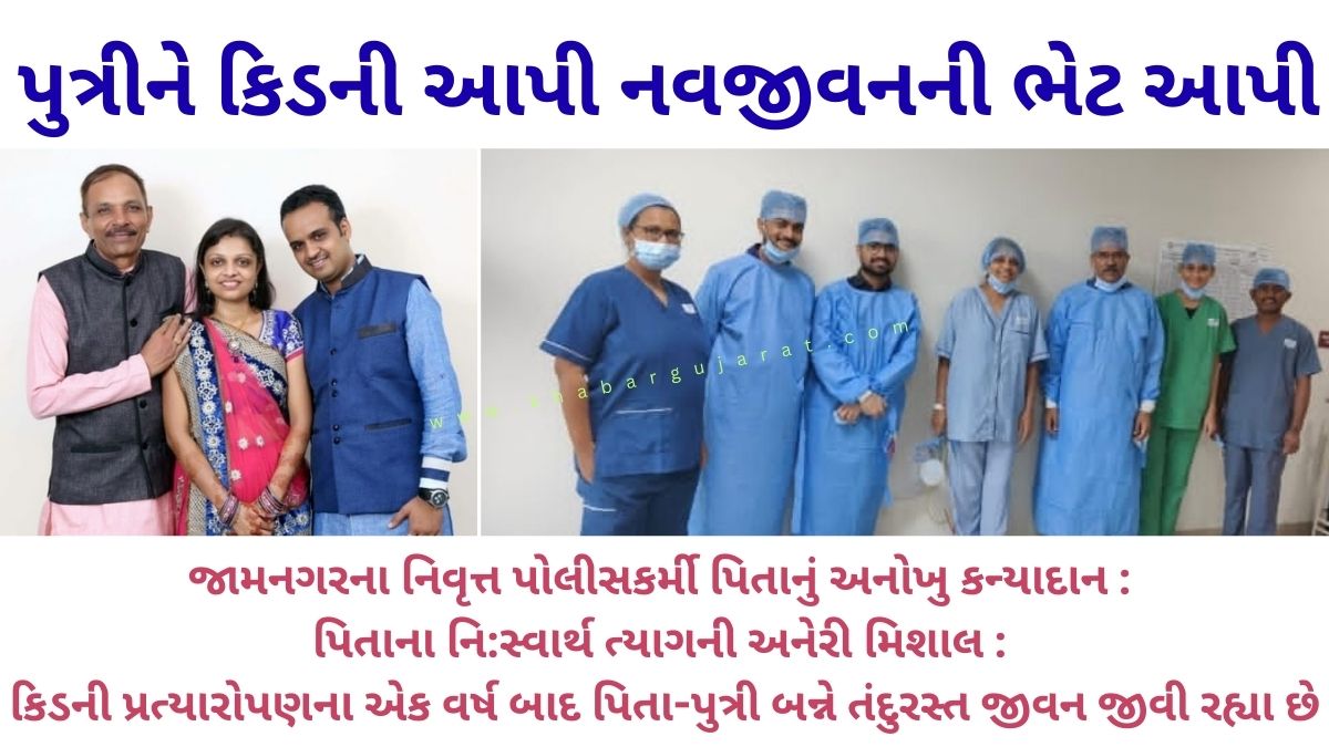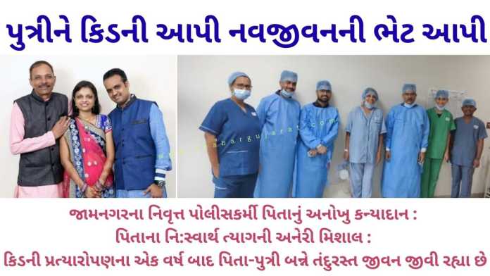 જામનગરના નિવૃત પોલીસ કર્મચારી પિતાએ અનોખુ કન્યાદાન કરી પુત્રીને કિડનીનું દાન આપી પિતાના નિસ્વાર્થ ત્યાગની અનોખી મીશાલનું દ્રષ્ટાંત પુરૂ પાડયું છે.