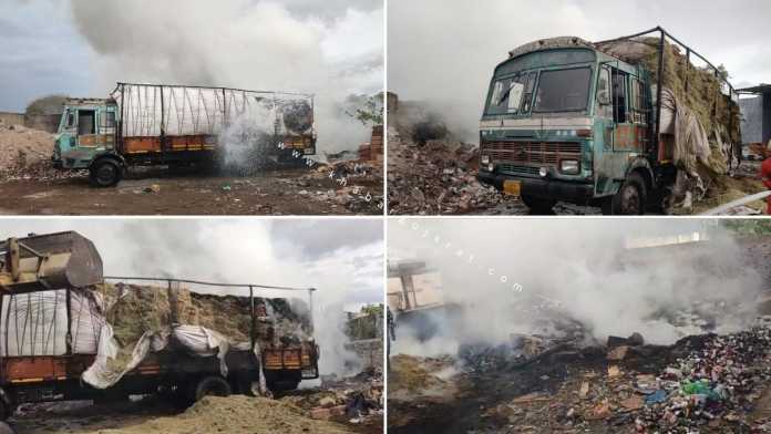 ખંભાળિયામાં સલાયા માર્ગ પર આવેલા એક મોટરસાયકલના શોરૂમ પાસે આજરોજ સવારના સમયે મગફળીનો ભૂક્કો ભરીને જઈ રહેલા એક ટ્રકમાં એકાએક આગ લાગી હતી. આ બનાવ અંગેની જાણના આધારે ફાયર વિભાગના જિલ્લા ફાયર અધિકારી મીતરાજસિંહ પરમારની સુચના મુજબ ફાયર સ્ટાફના જવાનો તાત્કાલિક ઘટના સ્થળે ફાયર ફાઈટર સાથે દોડી ગયા હતા અને પાણીનો મારો ચલાવીને કાબુ મેળવ્યો હતો. આ ઘટનામાં કોઈ જાનહાનિ થવા પામી નહોતી. પરંતુ ટ્રકમાં ભરેલો માલસામાન બળીને ખાખ થઈ ગયો હતો. આ બનાવનું કોઈ ચોક્કસ કારણ જાહેર થયું નથી.