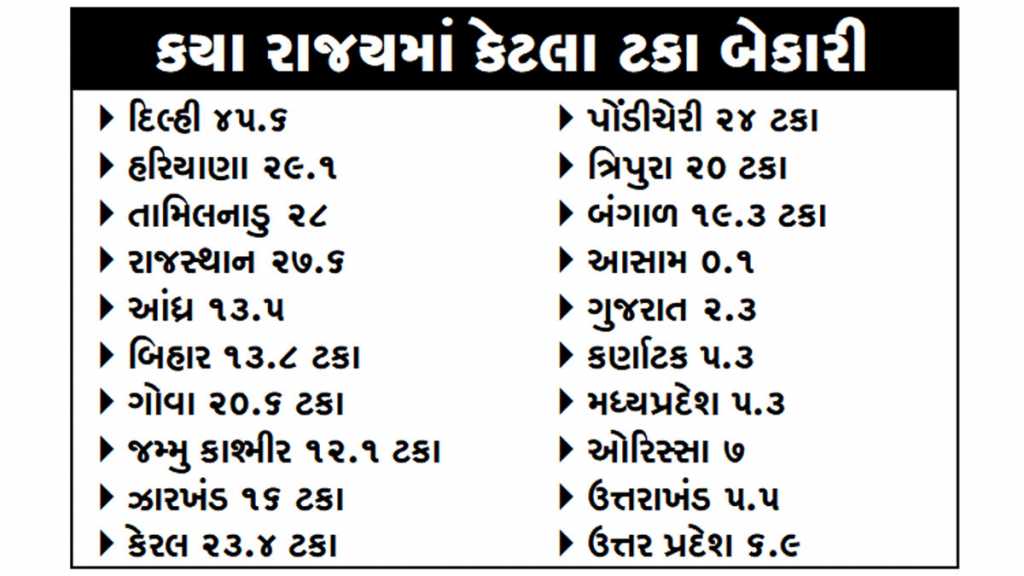 ઈકોનોમીમાં સુસ્તીના કારણે બેકારીનો દર વધી ગયો છે ત્યારે દેશની રાજધાની દિલ્હીમાં બેકારીની ટકાવારી 45 ટકા સુધી પહોંચી ચુકી છે. બીજા શબ્દોમાં કહેવામાં આવે તો દિલ્હીમાં દરેક બીજો વ્યક્તિ બેકાર છે.જ્યારે હરિયાણામાં બેરોજગારી દર 29.1 ટકા અને તામિલનાડુમાં 28 ટકા છે. આ આંકડા સેન્ટર ફોર મોનિટરિંગ ઈન્ડિયન ઈકોનોમી દ્વારા જાહેર કરાયા છે. જેમાં કહેવામાં આવ્યુ છે કે, દેશનો સરેરાશ બેરોજગારી દર 10.8 ટકા છે. મે મહિનામાં તે 11.9 ટકા હતો. શહેરી વિસ્તારોમાં બેરોજગારીનો દર 12.9 ટકા અને ગ્રામ્ય વિસ્તારોમાં 9.8 ટકા છે. રાજ્ય પ્રમાણે બેકારીના આંકડામાં ગુજરાતનો દેખાવો ઘણો સારો છે. સૌથી ઓછી બેકારી જે રાજ્યોમાં છે તેમાં ગુજરાતનો પણ સમાવેશ થાય છે. રાજ્ય પ્રમાણેના ટકાવારીના આંકડા આ પ્રમાણે છે.