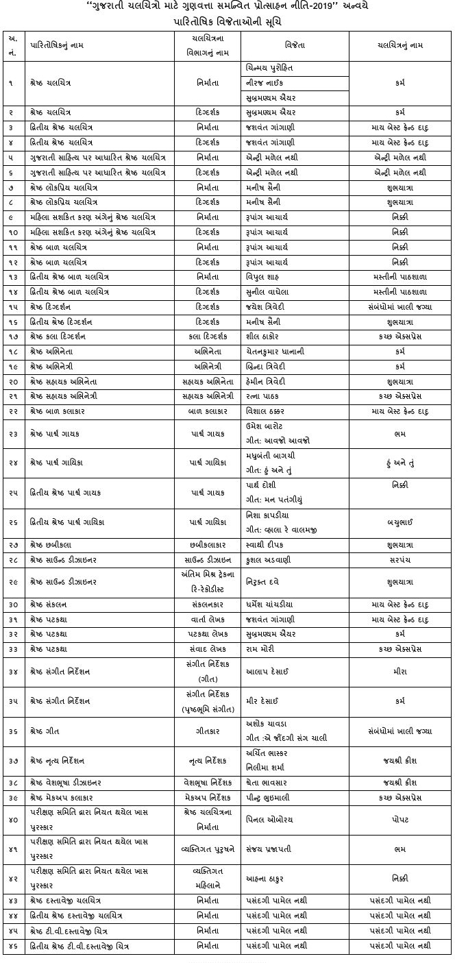 ગુજરાતી સિનેમાને પ્રોત્સાહન આપવા માટે ગુજરાત સરકાર દ્વારા ‘ગુણવતા સમન્વિત પ્રોત્સાહન નીતિ – 2019 અંતર્ગત વર્ષ 2023 માટેના પારિતોષિકોની જાહેરાત કરાઇ હતી ત્યારે વર્ષ 2023 દરમિયાન રિલીઝ થયેલી કુલ 46 કેટેગરીમાંથી 40 કેટેગરીમાં વિજેતાઓની પસંદગી કરવામાં આવી છે. જેમાં વિજેતાઓને રોકડ પુરસ્કાર તથા ટ્રોફી એનાયત કરશે. જેમાં કલાકારો, દિગ્દર્શકો અને ફિલ્મ ઉદ્યોગ સાથે જોડાયેલા અન્ય મહાનુભાવો ઉપસ્થિત રહેશે.