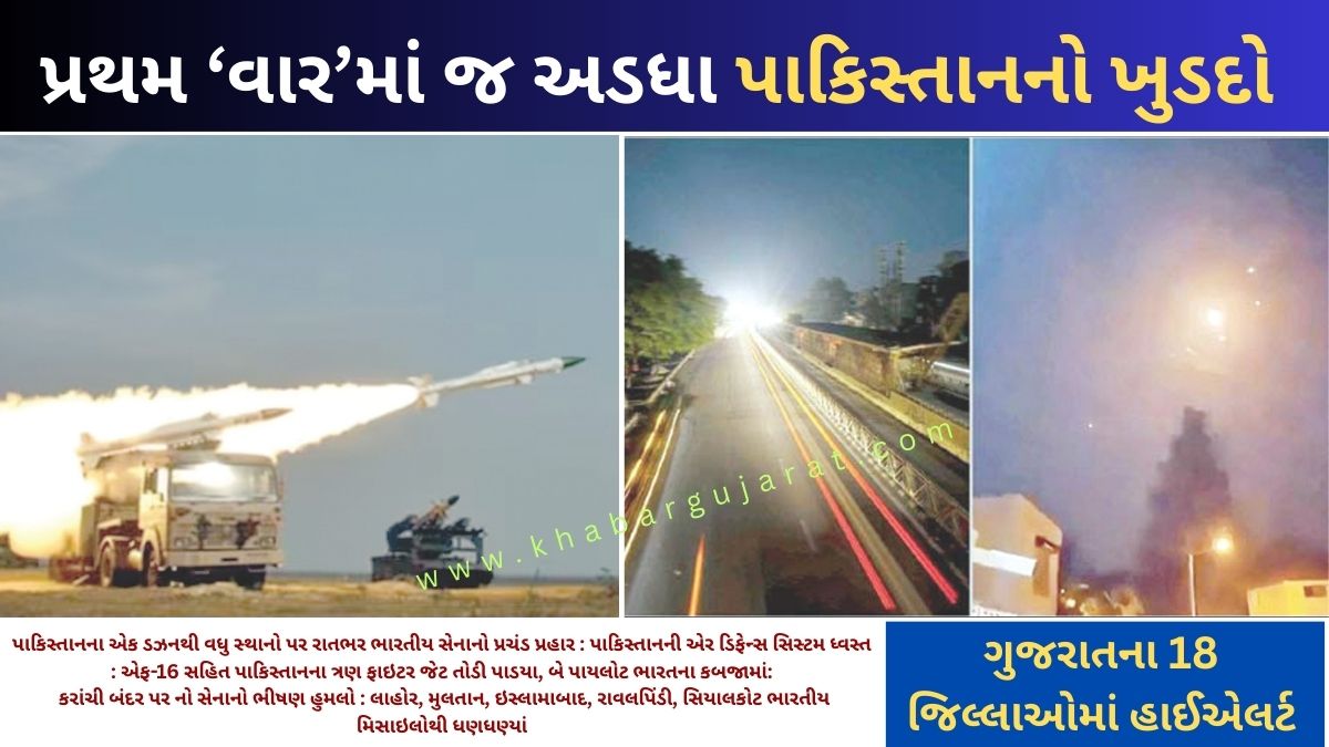 ભારતીય ભૂમીદળ- હવાઈદળ તથા નૌકાદળ ત્રણેયએ એક સાથે સંક્રમીત હુમલામાં પાક કબ્જાના કાશ્મીર ઉપરાંત લાહોર, કરાચી, રાવલપીંડી સહિતના પાકના પાંચ શહેરોને નિશાન બનાવીને ડ્રોન મિસાઈલ હુમલા કર્યા છે. જેમાં પાકમાં તબાહીના અને નાસભાગના દ્રશ્યો છે. ભારતીય સેનાએ પાક કબ્જાના કાશ્મીર અને ખાસ કરીને ત્રાસવાદીઓના ગઢ જેવા શિયાલકોટ સુધી મિસાઈલ દાગ્યા હતા.કોટલી ક્ષેત્રમાં પણ ભારે તબાહી સર્જી છે તો હવાઈ ક્ષેત્રમાં દેશના વધુ શહેરો પર પાકના મિસાઈલ ડ્રોન હુમલાને તોડી પાડવામાં આવ્યા છે. જેમાં સૌથી વધુ મહત્વપૂર્ણ રીતે પાક હવાઈદળના એક એફ-16 તથા બે જેએફ-17 સહિત 4 લડાયક વિમાનોને પણ અલગ અલગ રણભૂમિ પર તોડી પાડવામાં આવ્યા હતા.