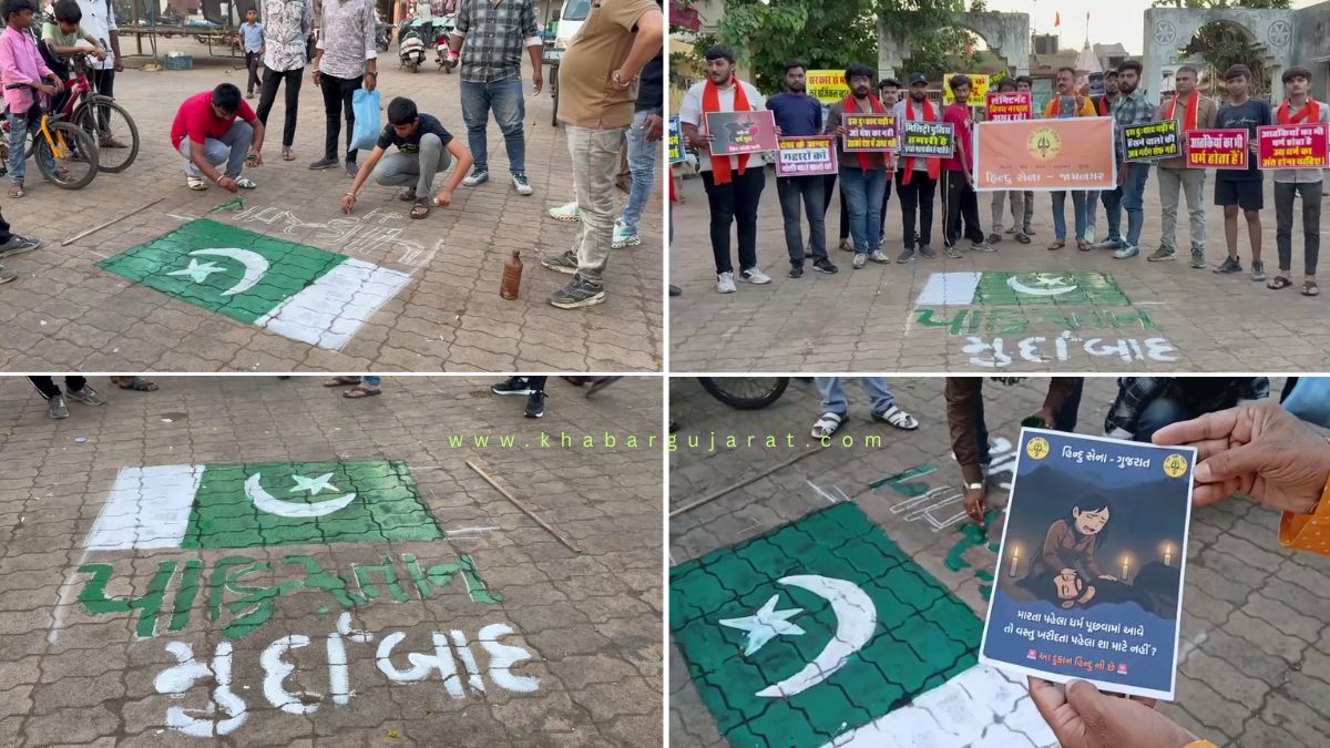 પહલગામમાં આતંકવાદી હુમલાની ઘટના બાદ હિન્દુ સેનાએ રોષ વ્યક્ત કર્યો હતો. સાધના કોલોની વિસ્તારમાં પાકિસ્તાનનો રાષ્ટ્રધ્વજનુ ચિત્ર બનાવી તેના પર ચાલી અને થુકીને રોષ વ્યક્ત કર્યો હતો. પાકિસ્તાન મુર્દાબાદનુ સૂત્ર લખી તેમજ બેનરો સાથે પાકિસ્તાનનો વિરોધ સુત્રોચાર કર્યા હતો. હિન્દુ સેનાના કાર્યકરોએ રોષ વ્યકત કર્યો હતો.