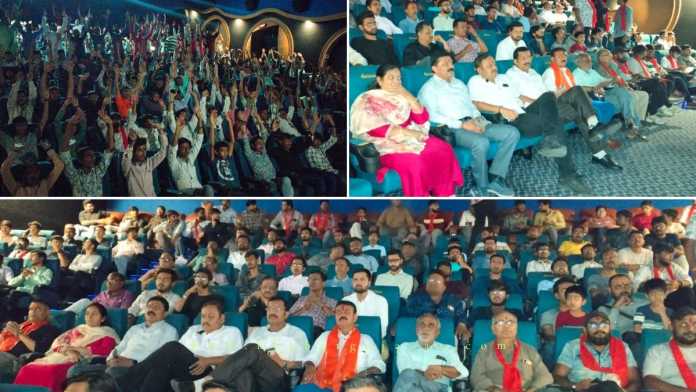 હિન્દુ સેના દ્વારા ગઇકાલે જામનગરવાસીઓને ‘છાવા’ ફિલ્મ નિ:શુલ્ક બતાવાવનું આયોજન કરવામાં આવ્યું હતું. જેમાં મેયર સહિતના મહાનુભાવો તેમજ શહેરીજનો તથા હિન્દુ સેનાના કાર્યકરો ઉપસ્થિત રહેલ હતા.છત્રપતિ શિવાજી જન્મજયંતિ નિમિતે હિન્દુ સેના દ્વારા શિવાજીના પુત્ર છત્રપતિ સંભાજી મહારાજના જીવન પર બનેલી ફિલ્મ ‘છાવા’ જામનગરના મેહુલ સિનેમેકસમાં નિ:શુલ્ક બતાવવાનું આયોજન કરવામાં આવ્યું હતું. હિન્દુ સેના ગુજરાત અધ્યક્ષ પ્રતિક ભટ્ટના નેજા હેઠળ કરાયેલા આ આયોજનમાં પ્રારંભમાં 11 કર્મકાંડી બ્રાહ્મણોની ટીમ દ્વારા મંત્રોચ્ચાર કરાયા હતા. આ તકે મેયર વિનોદભાઇ ખીમસૂર્યા, ડેપ્યુટી મેયર ક્રિષ્નાબેન સોઢા, સ્ટેન્ડીંગ કમિટીના ચેરમેન નિલેશભાઇ કગથરા, શહેર ભાજપ પ્રમુખ ડૉ. વિમલભાઇ કગથરા, હિન્દુ સેના સૌરાષ્ટ્ર મંત્રી મયુર ચંદન, સૌરાષ્ટ્ર ઉપપ્રમુખ ગૌરવ મેતા, હિન્દુ સેના વિભાગ અધ્યક્ષ અશોકભાઇ સોલંકી, જિલ્લા અધ્યક્ષ રોહિત ચૌહાણ, શહેર અધ્યક્ષ દિપક પિલ્લાઇ, શહેર મંત્રી જીતુભાઇ ગાલા સહિતના ઉપસ્તિ રહેલ હતા. શહેર ઉપપ્રમુખ ધીરેન નંદા, ઉપપમુખ મેહુલ મેતા, યુવા ઉપપ્રમુખ સાગર ચૌહાણ, સચિન જોષી, કરણ દવે, રામુ મદ્રાસી સહિતનાએ જહેમત ઉઠાવેલ હતી. મુખ્ય આયોજનમાં હિન્દુ સેના પૂર્ણકાલિન, કિશન નંદા અને મંથન અઘેરાએ વ્યવસ્થા સંભાળી હતી.