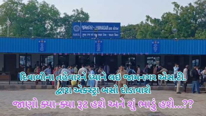 દિવાળીના તહેવારને લઇ જામનગર એસ.ટી.વિભાગ દ્વારા તા.16 ઓક્ટોબર થી તા.5 નવેમ્બર સુધી વિવિધ 8 જેટલા રૂટ પર એક્સ્ટ્રા બસોનું સંચાલન કરવામાં આવશે. જેમાં ભાડું અને રૂટ નીચે પ્રમાણે રહેશે.