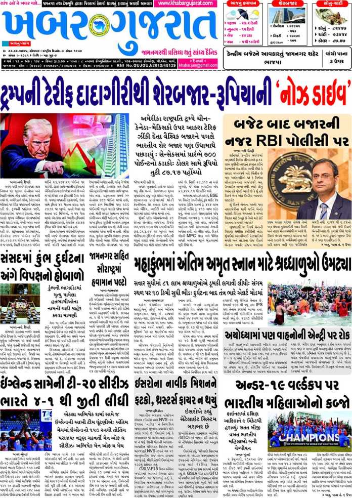 HomeepaperKhabar Gujarat Date 03-02-2025 Epaper epaper Khabar Gujarat Date 03-02-2025 Epaper February 3, 2025 Share FacebookTwitterWhatsAppTelegram - Advertisement - Share FacebookTwitterWhatsAppTelegram Previous articleટ્રમ્પની ટેરીફ દાદાગીરીથી શેરબજાર-રૂપિયાની ‘નોઝ ડાઇવ’Next articleરિલાયન્સ મહાકુંભમાં લાખો યાત્રાળુઓની સેવામાં સમર્પિત RELATED ARTICLES epaper Khabar Gujarat Date 16-12-2025 Epaper December 16, 2025 epaper Khabar Gujarat Date 15-12-2025 Epaper December 15, 2025 epaper Khabar Gujarat Date 13-12-2025 Epaper December 13, 2025 - Advertisment - Most Popular જામનગરના શ્રી બાલા હનુમાન મંદિરની તા.16/12/2025, મંગળવારની આરતીના દર્શન – VIDEO December 16, 2025 ‘जहां से भी घुसोगे, सामने हिंदुस्तानी फौजी खड़ा पाओगे’, બોર્ડર 2નું શક્તિશાળી ટીઝર રિલીઝ – VIDEO December 16, 2025 નવાનગર કો-ઓપરેટિવ બેંકને નવી આગેવાની – VIDEO December 16, 2025 વિખ્યાત ફુટબોલર મેસ્સીનો જામનગર એરપોર્ટ પરનો વીડિયો December 16, 2025 Load more