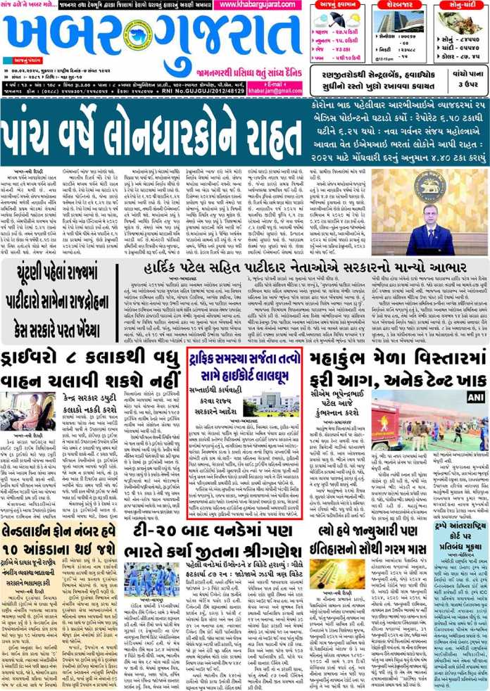 HomeepaperKhabar Gujarat Date 07-02-2025 Epaper epaper Khabar Gujarat Date 07-02-2025 Epaper February 7, 2025 Share FacebookTwitterWhatsAppTelegram - Advertisement - Share FacebookTwitterWhatsAppTelegram Previous articleગોરધનપર ગામના મકાનમાંથી દારૂનો વિશાળ જથ્થો ઝડપાયોNext articleસલાયામાં હુમલાના કેસમાં પાલિકાના તત્કાલિન પ્રમુખ સહિત 10ને 10 વર્ષની કેદ RELATED ARTICLES epaper Khabar Gujarat Date 16-12-2025 Epaper December 16, 2025 epaper Khabar Gujarat Date 15-12-2025 Epaper December 15, 2025 epaper Khabar Gujarat Date 13-12-2025 Epaper December 13, 2025 - Advertisment - Most Popular જામનગરના શ્રી બાલા હનુમાન મંદિરની તા.16/12/2025, મંગળવારની આરતીના દર્શન – VIDEO December 16, 2025 ‘जहां से भी घुसोगे, सामने हिंदुस्तानी फौजी खड़ा पाओगे’, બોર્ડર 2નું શક્તિશાળી ટીઝર રિલીઝ – VIDEO December 16, 2025 નવાનગર કો-ઓપરેટિવ બેંકને નવી આગેવાની – VIDEO December 16, 2025 વિખ્યાત ફુટબોલર મેસ્સીનો જામનગર એરપોર્ટ પરનો વીડિયો December 16, 2025 Load more