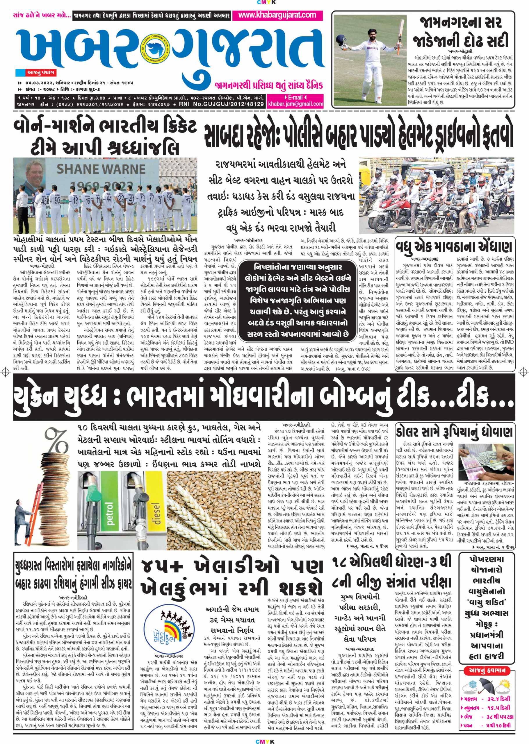 HomeepaperKhabar Gujarat dt.05-03-2022 epaper Khabar Gujarat dt.05-03-2022 March 5, 2022 Share FacebookTwitterWhatsAppTelegram - Advertisement - Tagsgujaratgujarati newsJamnagarJamnagar Newskhabar gujaratnews Share FacebookTwitterWhatsAppTelegram Previous articleયુક્રેન યુધ્ધ : ભારતમાં મોંઘવારીના બોમ્બનું ટીક…ટીક…Next articleજામનગર વિસ્તાર વિકાસ સતામંડળ (જાડા) ની સામાન્ય સભા RELATED ARTICLES epaper Khabar Gujarat Date 05-12-2025 Epaper December 5, 2025 epaper Khabar Gujarat Date 04-12-2025 Epaper December 4, 2025 epaper Khabar Gujarat Date 03-12-2025 Epaper December 3, 2025 - Advertisment - Most Popular જામનગરમાં જુતાકાંડ અંગે શું કહ્યું ગોપાલ ઈટાલીયાએ..?? – VIDEO December 5, 2025 જામનગરની સભામાં AAPના ધારાસભ્ય ગોપાલ ઈટાલીયા પર બુટ નો ઘા…. – VIDEO December 5, 2025 જામનગરમા ચૂંટણી પહેલા કોંગ્રેસને મોટો ઝટકો, AAPમાં મોટી સંખ્યામા કોગ્રેસના કાર્યકરો જોડાયા – VIDEO December 5, 2025 આવતીકાલે ઇલેક્ટ્રિક ફોર્મ્યુલા કારની રેસ થશે. શું ભારતીય ટીમ સારું પ્રદર્શન કરશે? બધાની નજર આ રેસર્સ પર છે. December 5, 2025 Load more