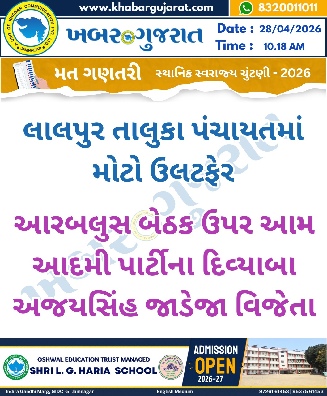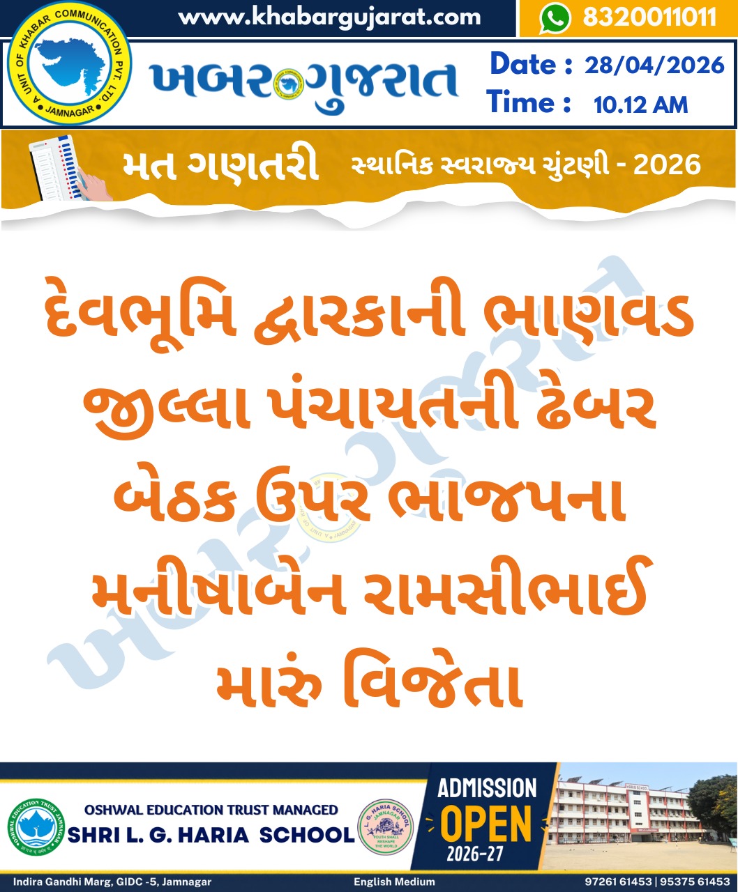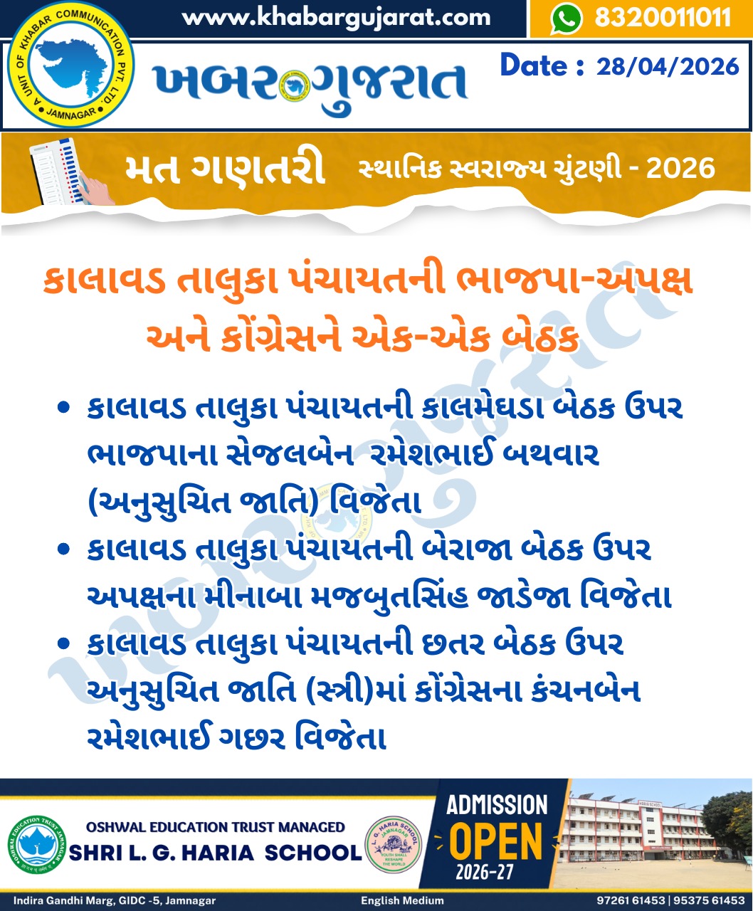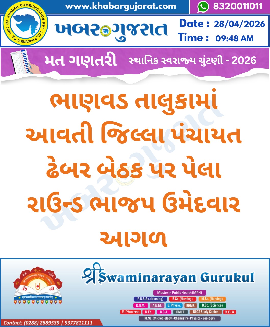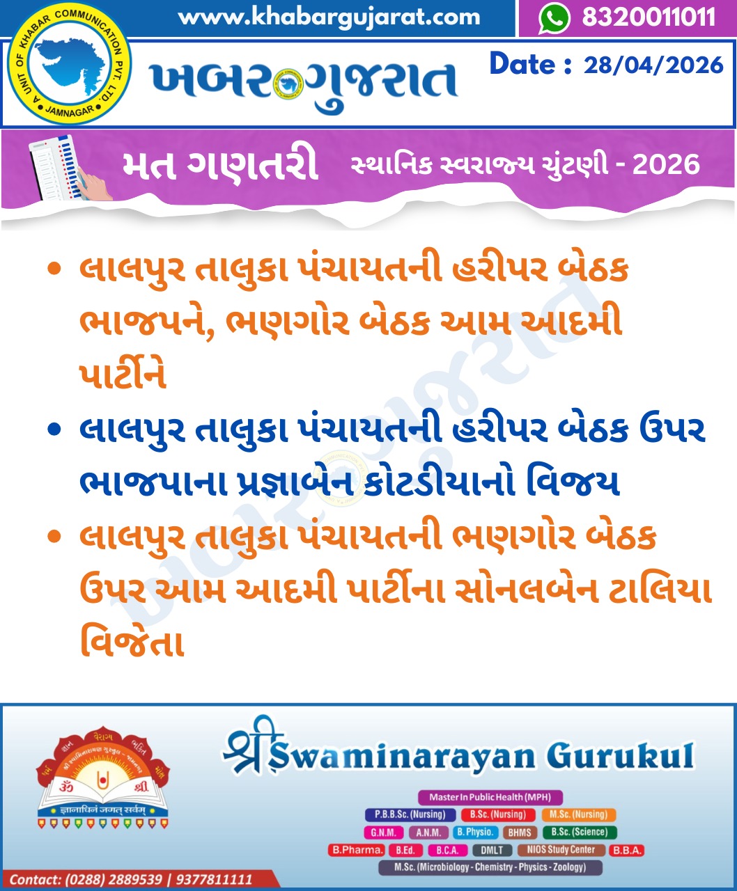 સ્થાનિક સ્વરાજ્ય ચુંટણીના પરિણામ – Khabar Gujarat LIVE Updates….