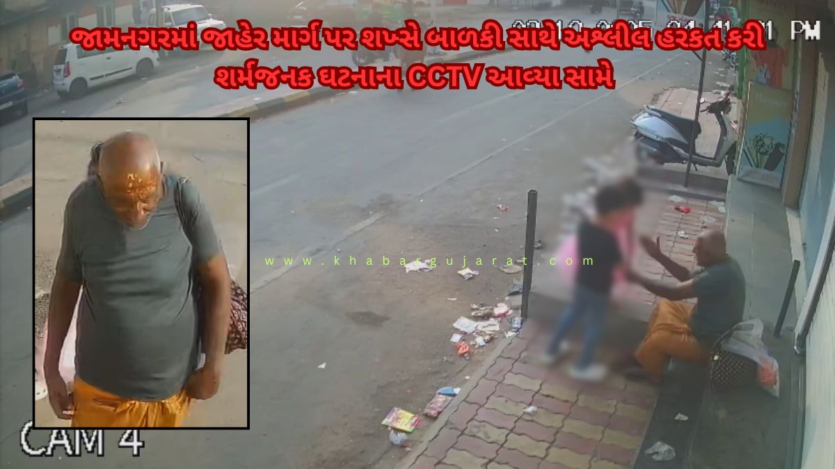 જામનગરના અપના બજાર નજીક જાહેર માર્ગ પર એક શખ્સ નાના બાળકો સાથે અશ્લીલ વર્તન કરતા સીસીટીવીમાં કેદ થયો હતો. શખ્સે બાળકોને રમવા બોલાવીને નાની બાળકીને ખોડામાં બેસાડીને અડપલા કર્યા હતા. આસપાસ હાજર લોકોએ તાત્કાલિક બાળકીને તેની પાસેથી દુર કરી હતી અને શખ્સને પકડવા પાછળ પણ દોડ્યા હતા.