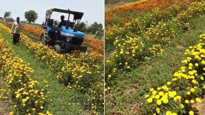 ખંભાળિયા પંથકમાં આ વર્ષે ખેડૂતોએ વિવિધ પ્રકારના ફૂલોનું વાવેતર કર્યું છે. પરંતુ તેઓને પૂરતા ભાવ ન મળતા હોવાનું ચર્ચાઈ રહ્યું છે. આ વચ્ચે રામનગર વિસ્તારમાં એક ખેડૂતે પોતાના ફૂલોના પાકમાં રોટાવેટર ફેરવી દીધાનું સામે આવ્યું છે. ખંભાળિયા નજીક આવેલા રામનગર વિસ્તારમાં રહેતા રાજેશભાઈ મૂળજીભાઈ કણજારીયા નામના એક ખેડૂતે પોતાના ખેતરમાં ગલગોટાના ફૂલોનું વાવેતર કર્યું હતું અને તેમને વિપુલ પ્રમાણમાં પાક પણ ઉત્પન્ન થયો હતો. આ વચ્ચે ફૂલોના ભાવની ગગડી ગયેલી માર્કેટ વચ્ચે ખેતરમાંથી ફૂલ વીણવાની મજૂરી જેટલા પણ પૈસા ઉપજતા ન હોય, આથી તેમણે ગલગોટાના ફૂલના ઉભા પાકમાં રોટાવેટર મશીન ફેરવી દીધું હતું.