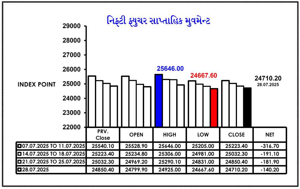 - તા.૨૮.૦૭.૨૦૨૫ ના રોજ નિફટી ફ્યુચર બંધ ભાવ @ ૨૪૭૧૦ પોઈન્ટ :- આગામી સંભવિત નિફ્ટી ફ્યુચર ૨૪૮૮૦ પોઈન્ટના પ્રથમ અને ૨૪૯૭૯ પોઈન્ટના અતિ મહત્વના સ્ટ્રોંગ સપોર્ટથી ટ્રેડીંગ સંદર્ભે ૨૪૬૭૬ પોઈન્ટ થી ૨૪૬૦૬ પોઈન્ટ આસપાસ અતિ મહત્વની સપાટીને સ્પર્શી શકે તેવી સંભાવના ધરાવે છે. નિફ્ટી ફ્યુચર ૨૪૬૭૬ પોઈન્ટ નજીક સાવધાનીપૂર્વક પોઝિશન બનાવવી જોઇએ….!!!