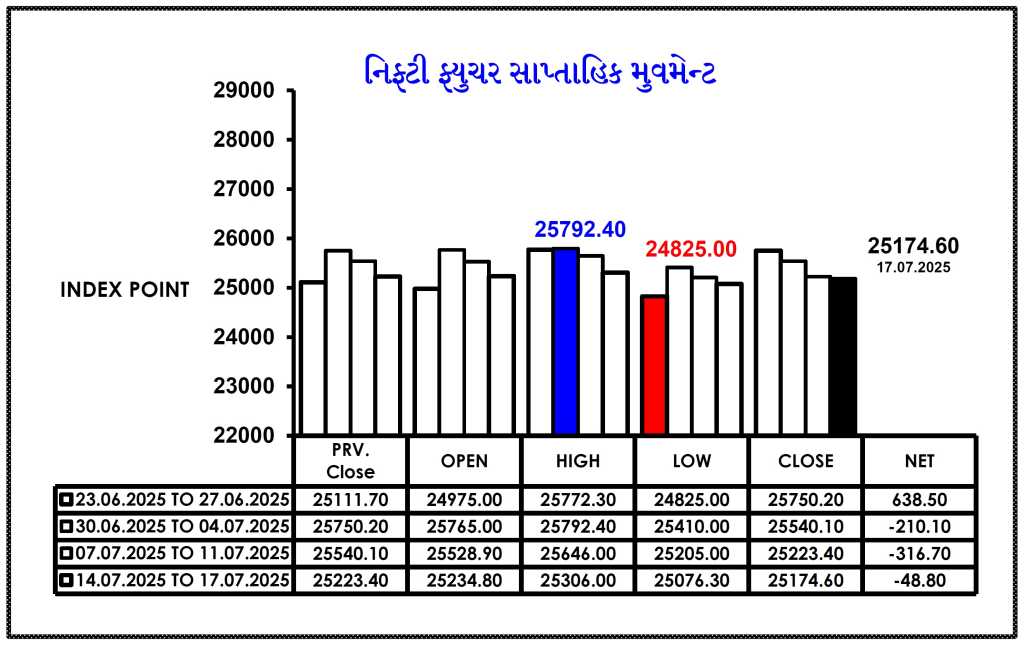 - તા.૧૭.૦૭.૨૦૨૫ ના રોજ નિફટી ફ્યુચર બંધ ભાવ @ ૨૫૧૭૪ પોઈન્ટ :- આગામી સંભવિત નિફ્ટી ફ્યુચર ૨૫૦૭૭ પોઈન્ટના પ્રથમ અને ૨૫૦૦૭ પોઈન્ટના અતિ મહત્વના સ્ટ્રોંગ સપોર્ટથી ટ્રેડીંગ સંદર્ભે ૨૫૨૦૨ પોઈન્ટ થી ૨૫૨૭૨ પોઈન્ટ આસપાસ અતિ મહત્વની સપાટીને સ્પર્શી શકે તેવી સંભાવના ધરાવે છે. નિફ્ટી ફ્યુચર ૨૫૦૦૭ પોઈન્ટ નજીક સાવધાનીપૂર્વક પોઝિશન બનાવવી જોઇએ….!!!
