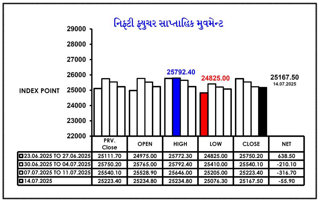 - તા.૧૪.૦૭.૨૦૨૫ ના રોજ નિફટી ફ્યુચર બંધ ભાવ @ ૨૫૧૬૭ પોઈન્ટ :- આગામી સંભવિત નિફ્ટી ફ્યુચર ૨૫૦૮૮ પોઈન્ટના પ્રથમ અને ૨૫૦૦૮ પોઈન્ટના અતિ મહત્વના સ્ટ્રોંગ સપોર્ટથી ટ્રેડીંગ સંદર્ભે ૨૫૨૦૨ પોઈન્ટ થી ૨૫૨૩૨ પોઈન્ટ આસપાસ અતિ મહત્વની સપાટીને સ્પર્શી શકે તેવી સંભાવના ધરાવે છે. નિફ્ટી ફ્યુચર ૨૫૦૦૮ પોઈન્ટ નજીક સાવધાનીપૂર્વક પોઝિશન બનાવવી જોઇએ….!!!