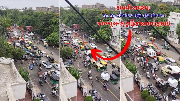 જામનગરના પી.એન. માર્ગ પર અવારનવાર ટ્રાફિકજામની સમસ્યા સર્જાતી રહે છે. જી. જી. હોસ્પિટલ પાસેના ટ્રાફિક સિગ્નલનું ઢંગધડા વગરનું નિયમનને પરિણામે ટ્રાફિકથી ધમધમતા આ માર્ગ પર અવારનવાર ટ્રાફિકજામની સમસ્યા સર્જાતી રહે છે. આજે ફરી એકવખત જી. જી. હોસ્પિટલ નજીક ટ્રાફિકજામમાં એમ્બ્યુલન્સ ફસાઇ હતી. અહીં જી. જી. હોસ્પિટલ પાસે તથા ટ્રાફિક સિગ્નલના ઢંગધડા વિનાના નિયમનના પગલે જી. જી. હોસ્પિટલથી ડી.કે.વી.કોલેજ સુધી અને જી. જી. હોસ્પિટલથી અંબર ચોકડી સુધી છાશવારે વાહનોના થપ્પા લાગી જાય છે. તાજેતરમાં ગત્ તા. 7 જુલાઇના રોજ આ માર્ગ પર આ જ જગ્યાએ એમ્બ્યુલન્સ ફસાઇ હતી. તેમજ 15 જુલાઇના રોજ જી. જી. હોસ્પિટલના પટાંગણમાં એમ્બ્યુલન્સ ફસાઇ હતી. ત્યારે ફરી વખત આજે તા. 21 જુલાઇના રોજ ફરી એકવખત ટ્રાફિક જામમાં એમ્બ્યુલન્સ ફસાઇ જવાની ઘટના સામે આવી છે. એમ્બ્યુલન્સ ડ્રાઇવર દ્વારા સતત સાયરન વગાડવા છતાં ટ્રાફિક સિગ્નલ ખુલતા ન હોય સમસ્યા વકરે છે. આમ, માત્ર 15 દિવસના ગાળામાં ત્રણ વખત એમ્બ્યુલન્સ ટ્રાફિકજામમાં ફસાતા ટ્રાફિક પોલીસ શું કરી રહી છે? તે લોકમુખે ચર્ચાઇ રહ્યું છે. ટ્રાફિકજામમાં એમ્બ્યુલન્સમાં રહેલ દર્દીને જો કંઇ થાય તો જવાબદાર કોણ?