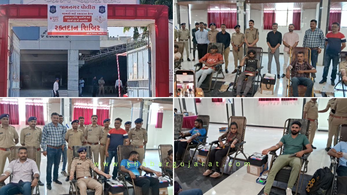 જામનગર પોલીસ દ્વારા જી.જી. હોસ્પિટલ અને જિલ્લા સુરક્ષા સેતુ સોસાયટી જામનગરના સહયોગથી થેલેસેમિયા સામે લડી રહેલા બાળકો માટે આજરોજ જામનગર શહેરમાં ગુર્જર સુથાર જ્ઞાતિની વાડી, ગાંધીનગર મેઇન રોડ, જામનગર ખાતે રક્તદાન કેમ્પનું આયોજન કરવામાં આવ્યું હતું. આ તકે જામનગર જિલ્લા પોલીસ વડા પ્રેમસુખ ડેલુ, ડીવાયએસપી જયવીરસિંહ ઝાલા, આર.બી. દેવધા, પીઆઇ એમ.વી. મોઢવાડીયા સહીતના અધિકારીઓ, જામનગર શહેર ભાજપ પ્રમુખ બિનાબેન કોઠારી, જામનગર દક્ષિણ વિધાનસભાના ધારાસભ્ય દિવ્યેશભાઇ અકબરી, મેયર વિનોદભાઇ ખિમસૂર્યા, ડે.મેયર ક્રિષ્નાબેન સોઢા, શાસકપક્ષના નેતા આશિષભાઇ જોશી, જામનગર જિલ્લા પંચાયત પ્રમુખ મયબેન ગડચર, પૂર્વ શહેર ભાજપ પ્રમુખ ડો. વિમલભાઇ કગથરા, અગ્રણી ગિરીશભાઇ અમેથીયા તેમજ પોલીસ કર્મચારીઓ મોટી સંખ્યામાં ઉપસ્થિત રહ્યા હતાં તેમજ રક્તદાનમાં પણ મોટી સંખ્યામાં જોડાઇ રક્તદાન કર્યું હતું.