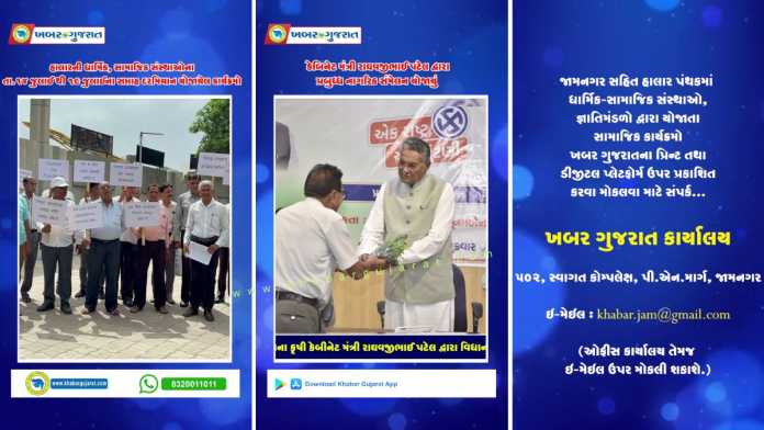 જામનગર સહિત હાલાર પંથકમાં ધાર્મિક-સામાજિક સંસ્થાઓ, જ્ઞાતિમંડળો દ્વારા યોજાતા સામાજિક કાર્યક્રમો ખબર ગુજરાતના પ્રિન્ટ તથા ડીજીટલ પ્લેટફોર્મ ઉપર પ્રકાશિત કરવા મોકલવા માટે સંપર્ક…
