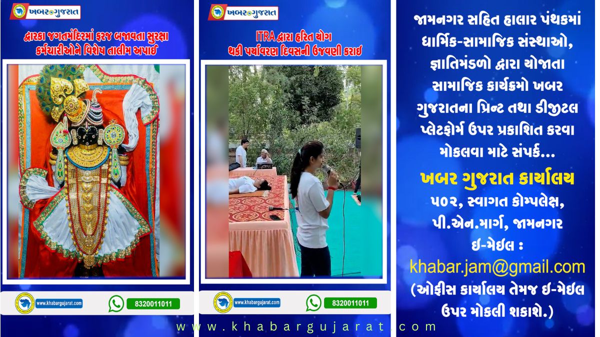 જામનગર સહિત હાલાર પંથકમાં ધાર્મિક-સામાજિક સંસ્થાઓ, જ્ઞાતિમંડળો દ્વારા યોજાતા સામાજિક કાર્યક્રમો ખબર ગુજરાતના પ્રિન્ટ તથા ડીજીટલ પ્લેટફોર્મ ઉપર પ્રકાશિત કરવા મોકલવા માટે સંપર્ક…