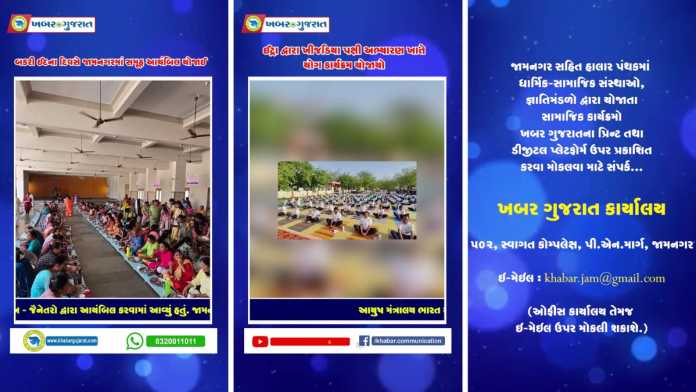 જામનગર સહિત હાલાર પંથકમાં ધાર્મિક-સામાજિક સંસ્થાઓ, જ્ઞાતિમંડળો દ્વારા યોજાતા સામાજિક કાર્યક્રમો ખબર ગુજરાતના પ્રિન્ટ તથા ડીજીટલ પ્લેટફોર્મ ઉપર પ્રકાશિત કરવા મોકલવા માટે સંપર્ક…