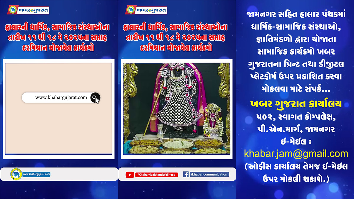 જામનગર સહિત હાલાર પંથકમાં ધાર્મિક-સામાજિક સંસ્થાઓ, જ્ઞાતિમંડળો દ્વારા યોજાતા સામાજિક કાર્યક્રમો ખબર ગુજરાતના પ્રિન્ટ તથા ડીજીટલ પ્લેટફોર્મ ઉપર પ્રકાશિત કરવા મોકલવા માટે સંપર્ક…