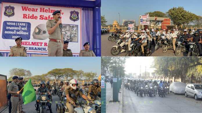 વાહન અકસ્માતોના બનાવો વધતા જઇ રહ્યાં છે. ટુ-વ્હીલરમાં હેલમેટ અને મોટરકારમાં સીટ બેલ્ટ લોકો ઉપયોગ ના કરતાં હોય અકસ્માતો જીવલેણ પણ સાબિત થતાં હોય છે. માર્ગ અકસ્માતોમાં મૃત્યુનું પ્રમાણ ઘટાડવા હેલમેટ અને સીટ બેલ્ટ જરુરી છે. લોકોમાં હેલમેટ અંગે જાગૃતિ આવે તે માટે પોલીસ દ્વારા અનેક પ્રયાસો કરવામાં આવતા રહે છે. જેના ભાગરુપે લોકોમાં હેલમેટ અંગે જાગૃતિ આવે તે માટે જામનગર શહેરમાં પોલીસ દ્વારા રવિવારે રેલીનું આયોજન કરવામાં આવ્યું હતું. જામનગર શહેરના લાખોટા ગેઇટ નં. 1 પાસેથી આ રેલીનું આયોજન કરવામાં આવ્યું હતું. જામનગર જિલ્લા પોલીસ વડા પ્રેમસુખ ડેલુ દ્વારા આ રેલીનું પ્રસ્થાન કરાવ્યું હતું. આ રેલીમાં પોલીસ કર્મચારીઓની સાથે-સાથે એરફોર્સ, આર્મી અને નેવીના જવાનો હેલમેટ પહેરી જોડાયા હતાં.