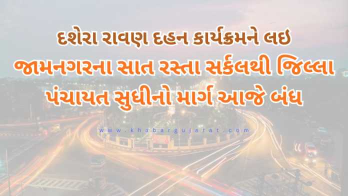 જામનગર શહેરમાં દશેરાના તહેવાર નિમિતે આજે રાવણ દહન કાર્યક્રમનું આયોજન કરાયું છે. પ્રદર્શન ગ્રાઉન્ડ ખાતે આયોજીત રાવણ દહનના કાર્યક્રમમાં મોટી સંખ્યામાં લોકો ભાગ લેનાર છે. મોટી સંખ્યામાં આવતા લોકોના કારણે ટ્રાફીકની સમસ્યા ઉદભવીત થવાની સંભાવના રહે છે. આથી અધિક જિલ્લા મેજીસ્ટ્રેટ ભાવેશ એન. ખેર દ્વારા આજરોજ તા.2ના રોજ બપોરે 3 વાગ્યાથી રાત્રીના 12 વાગ્યા સુધી જામનગર શહેરના સાત રસ્તા સર્કલથી જિલ્લા પંચાયત સર્કલ સુધીનો રસ્તો બંધ રાખવા જાહેરનામુ બહાર પાડયું છે.