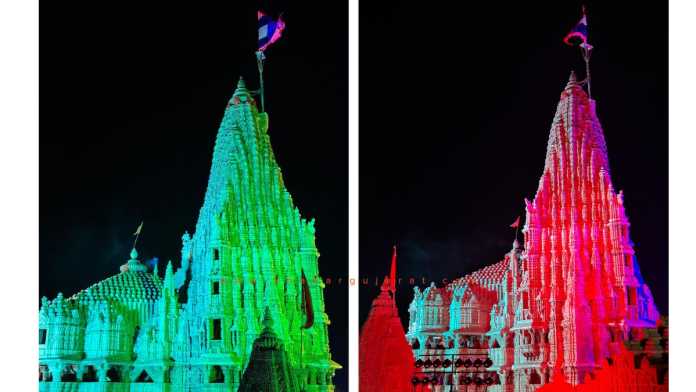 રંગબેરંગી રોશનીથી મંદિરને શણગારવામાં આવેલ : જન્માષ્ટી, દિવાળી જેવા પર્વ પર આ પ્રકારે જગતમંદિરમા રોશનીથી શણગારવામાં આવે છે, આ વખતે ફુલડોલ ઉત્સવમાં પણ રંગીન શણગાર કરવામાં આવેલ