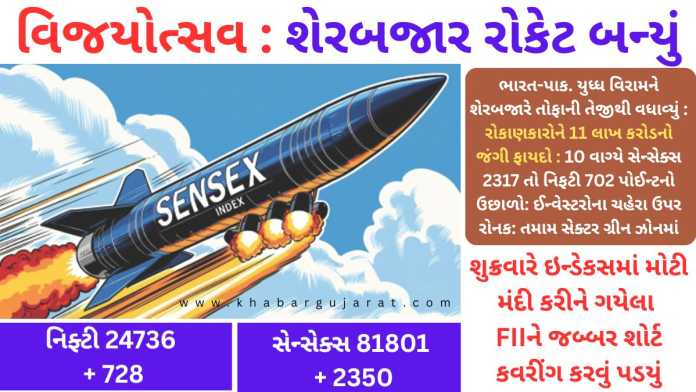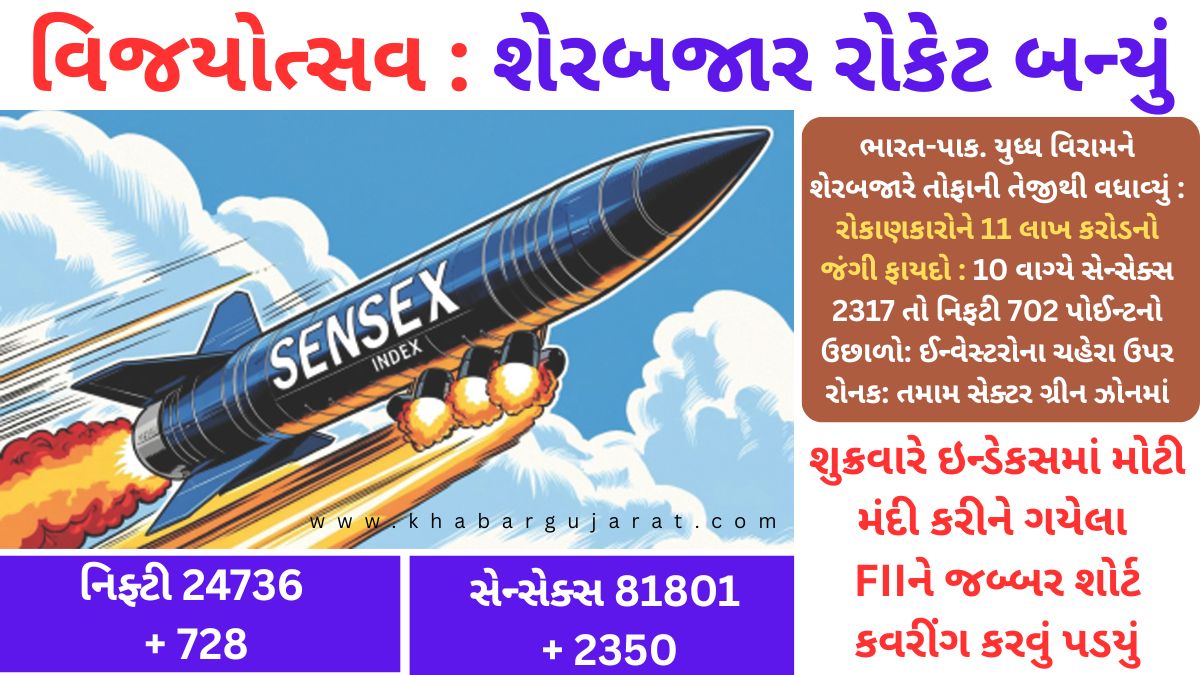 ભારત અને પાકિસ્તાન વચ્ચે યુદ્ધવિરામની અસર અઠવાડિયાના પહેલા ટ્રેડિંગ દિવસે સોમવારે ભારતીય શેરબજાર પર જોવા મળી હતી આ સાથે આજે શેરબજારમાં મોટો ઉછાળો જોવા મળી રહ્યો છે. બીએસઈ સેન્સેક્સ 1,300 પોઈન્ટથી વધુના વધારા સાથે ખુલ્યો અને થોડીવારમાં જ તેમાં 2300 પોઈન્ટથી વધુનો વધારો થયો. સવારે 10 વાગ્યે, સેન્સેક્સ 2317 પોઈન્ટ વધીને 81772 પર પહોંચ્યો. નેશનલ સ્ટોક એક્સચેન્જનો નિફ્ટી 50 ઈન્ડેક્સ પણ 702 પોઈન્ટ વધારા સાથે 24710 પોઈન્ટ પર ટ્રેડ કરી રહ્યો છે. સન ફાર્મા સિવાય સેન્સેક્સના બધા શેરોમાં વધારો જોવા મળી રહ્યો છે.શુક્રવારે ઇન્ડેકસમાં મોટી મંદી કરીને ગયેલા એફઆઇઆઇને જબ્બર શોર્ટ કવરીંગ કરવું પડયું હતું. જેને કારણે બજાર ખુલ્યા બાદ રોકેટ બની ગયું હતું.
