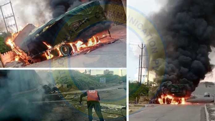 ખંભાળિયા શહેરની નજીક જામનગર દ્વારકા ધોરીમાર્ગ પર આજરોજ કોલસા ભરીને જઈ રહેલા એક ડમ્પર અને આ માર્ગ પણ જઈ રહેલા સિમેન્ટ ભરેલા એક ટ્રક વચ્ચે અકસ્માત સર્જાયો હતો. આ ગંભીર પ્રકારના અકસ્માતનામાં સિમેન્ટ ભરેલો ટ્રક બળીને ખાખ થઇ ગયો હતો.