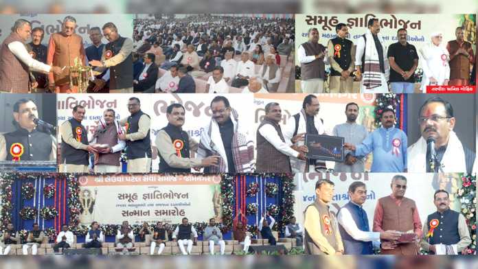 તા. 04-01-2026 ના રોજ યોજાયેલ મુખ્ય સમારોહમાં રાજ્યના કેબિનેટ મંત્રી જીતુભાઈ વાઘાણી, રાજ્ય મંત્રી કૌશિકભાઈ વેકરીયા,પૂર્વ કેબિનેટ મંત્રી અને ધારાસભ્ય રાઘવજીભાઈ પટેલ, ખોડલધામ ટ્રસ્ટના ટ્રસ્ટી અને ધારાસભ્ય રમેશભાઈ ટીલારા,દિવ્યેશભાઈ અકબરી વિશેષ ઉપસ્થિત રહ્યા હતા.લેઉવા પટેલ સમાજ દ્વારા આ નવનિયુક્ત મંત્રીઓનું જામનગરની ધરા પર ભવ્ય સન્માન કરવામાં આવ્યું હતું. આ કાર્યક્રમમાં ધારાસભ્ય રાઘવજીભાઈ પટેલ દિવ્યેશભાઈ અકબરી તેમજ પૂર્વ સાંસદ ચંદ્રેશભાઇ પટેલ રમેશભાઈ મુંગરા, સહિતના સમાજના આગેવાનો તેમજ રાજકીય આગેવાનો અને સામાજિક આગેવાનો ઉપસ્થિત રહ્યા હતા. આ પ્રસંગે મંત્રી જીતુભાઇ વાઘાણીએ જણાવ્યું હતું કે, “અન્ન ભેગા એના મન ભેગાના ભાવ સાથે પાટીદાર સમાજ આજે અન્ય સમાજોને પણ સાથે રાખીને દેશને વિકાસની નવી રાહ ચીંધી રહ્યો છે. આ સંગઠિત શક્તિ શિક્ષણ અને આરોગ્ય ક્ષેત્રે નવા આયામો સર કરશે.