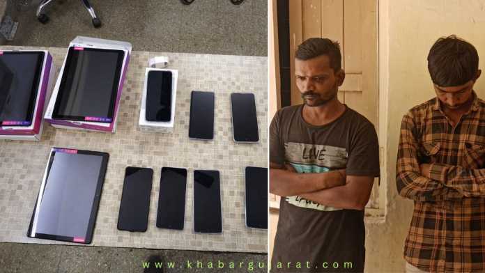 ચોરીમાં સંડોવાયેલા તસ્કર અંગેની હે.કો. સંજયભાઇ પરમાર, પો.કો. કલ્પેશભાઇ અઘારા, જયદીપસિંહ જાડેજાને મળેલી બાતમીના આધારે પોલીસ અધિક્ષક પ્રેમસુખ ડેલુની સૂચનાથી શહેર ડીવાયએસપી જયવીરસિંહ ઝાલાના માર્ગદર્શન હેઠળ પીઆઇ પી. પી. ઝા, પીએસઆઇ એમ. વી. મોઢવાડિયા, હે.કો. દશરથસિંહ પરમાર, સંજયભાઇ પરમાર, પો.કો. જયદીપસિંહ જાડેજા, કલ્પેશભાઇ અઘારા, વિપુલભાઇ ગઢવી સહિતના સ્ટાફે બેડેશ્ર્વર પુલ નીચેથી શનિ જગદિશ સરવૈયા (ઉ.વ. 29, રહે. નવાગામ ઘેડ), વિક્રમ ઉર્ફે રોટી (ઉ.વ.25, રહે. નવાગામ) નામના બન્ને શખ્સોને દબોચી લઇ ટ ટ્રાવેલ્સની ઓફિસમાંથી ચોરી કરેલા 14 મોબાઇલ ફોન અને ટેબ્લેટ મળી કુલ રૂપિયા 1,18,500નો મુદામાલ કબ્જે કરી ચોરીનો ભેદ ગણતરીના કલાકોમાં જ ઉકેલ્યો હતો.