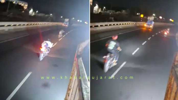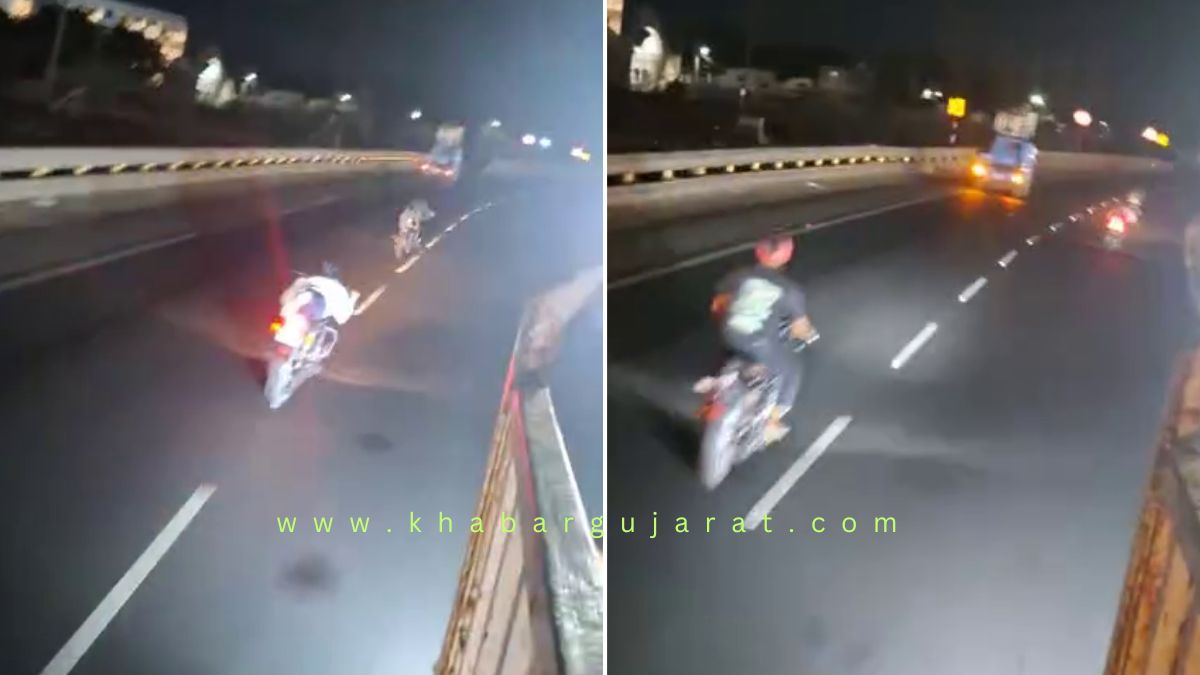 જામનગર – ખંભાળિયા હાઈવે પર બાઈક ચાલકો બેફામ પુર ઝડપે બેફિકરાઈથી બાઈકો ચાલવાતા જોવા મળ્યા હતાં. જેમાં બાઈક પર સુતા – સુતા સ્ટંટ અને રેસ કરતા વિડીયો વાયરલ થયા હોવાનું જણાયું હતું. આવા જ જોખમી સ્ટંટના કારણે થોડા સમય પહેલા અકસ્માત સર્જાયો હતો. હાઈવે પર પુરઝડપે જોખમી સ્ટંટ કરતા યુવાનો વિડીયોમાં જોવા મળે છે.