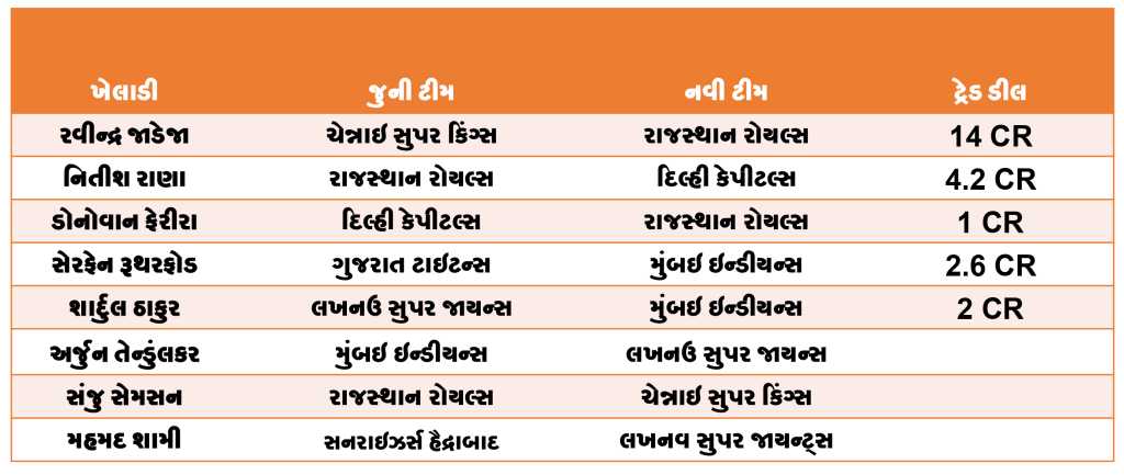 TATA IPL 2026ની રિટેન્શન ડેડલાઇન પહેલા, ફ્રેન્ચાઇઝીઓ વચ્ચે કેટલાક મોટા ખેલાડીઓના ટ્રેડ પર સહમતિ બની છે. આ ટ્રેડથી ઘણાં સ્ટાર ખેલાડીઓ નવી ટીમમાં રમતા જોવા મળશે. રવિન્દ્ર જાડેજા, સંજુ સેમસન, સાદુર ઠાકુર સહિતના ખેલાડીઓ ટ્રેડ થઇ અન્ય ટીમમાં ગયા છે. ચાલો જોઈએ કે કયા ખેલાડી કઈ ટીમમાં ગયા.